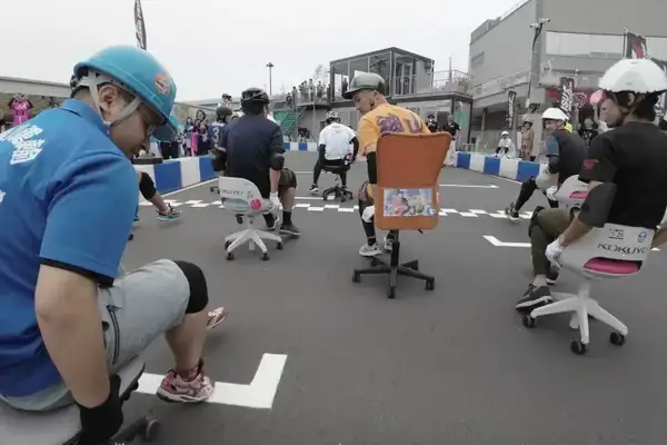 Japanese office workers compete in street races on office chairs, covering over 20 kilometers in two hours.