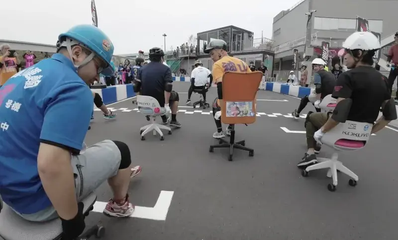 In Japan, a new sport is becoming popular. People race on office chairs in the streets. Teams of three people compete together. They sit on chairs and kick the ground to move backwards. They race for two hours and try to go as far as possible.